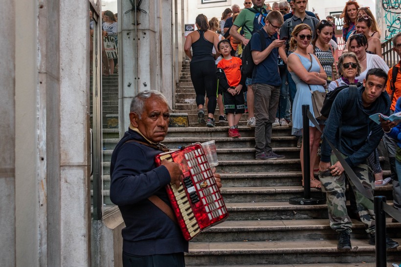Надо понимать, что Санта Жуста – памятник национального значения в Португалии и просто хотя бы проложить свой маршрут рядом с подъемником (не увидеть лифт точно не удастся – он находится прямо у центральной площади города) и сделать его фото явно стоит. Это действительно будут хорошие кадры, которые украсят фотоальбомы и инстаграммы. Стоит ли подниматься наверх? Тут надо знать, что Санта-Жуста перестал быть просто подъемником, выполняющим обывательскую функцию. Санта-Жуста – это символ столицы Португалии, со всеми вытекающими оттуда последствиями. И вот тут-то все зависит от нервной системы ин. туриста: если при мысли о ЖЭКе и поликлиниках ин.турист не впадает в панику -можно и постоять. Я постояла. Скажу вам честно: очередь бескрайняя, люди прибывают отовсюду туристическими пачками, вокруг лифта паразитируют попрошайки и лавочники. К этому стоит добавить то, что Португалия – сама по себе страна не северная, и в очереди через два часа (а я отстояла два часа) будет ужасно жарко. Вообще лифт работает с семи утра до семи вечера, и может быть, это мой промах что я не пошла туда спозаранку – у лифта я была в 11. И попала в самое пекло. Потом я много раз ещё проходила мимо Санта -Жуста, и поверьте туристов там не убавлялось.