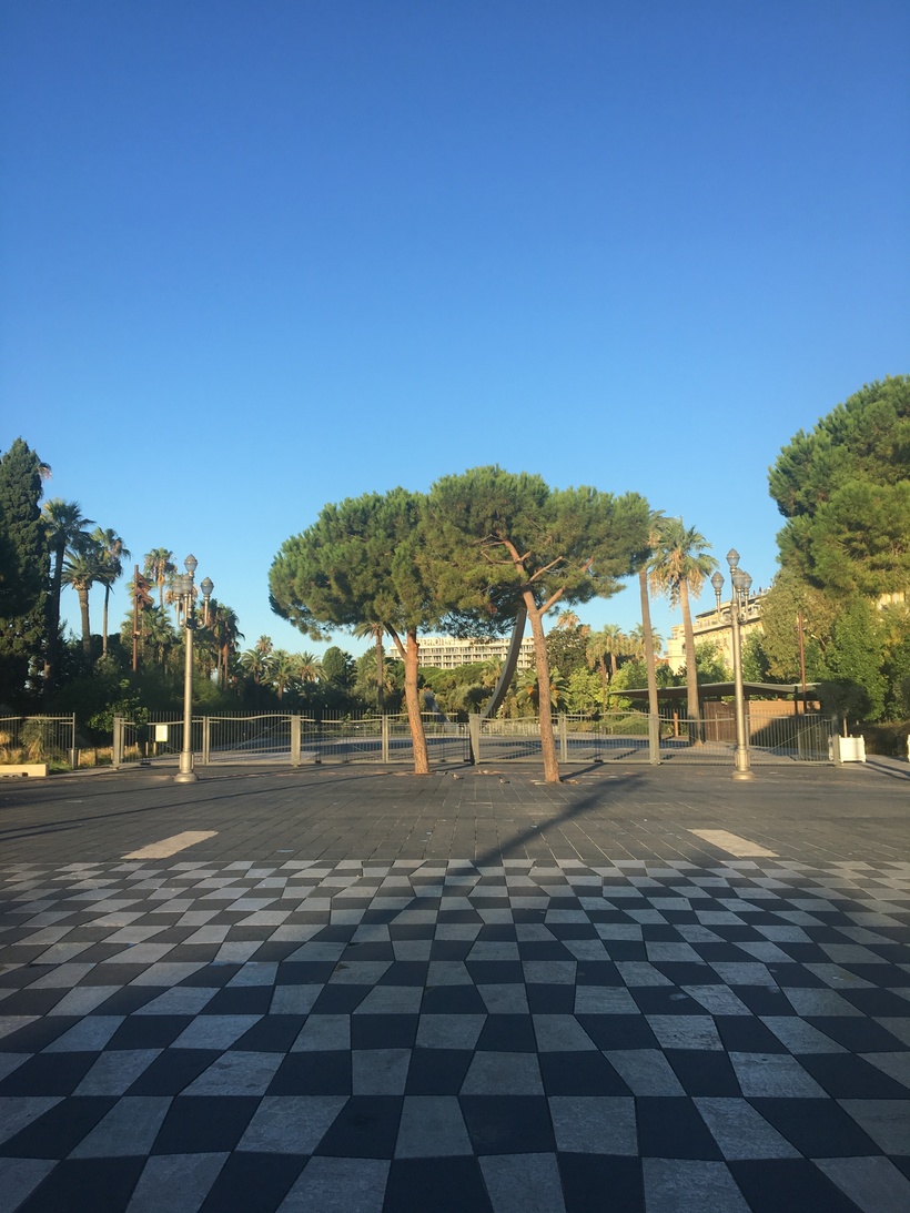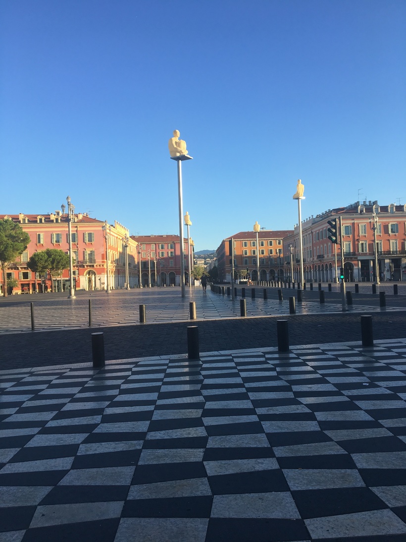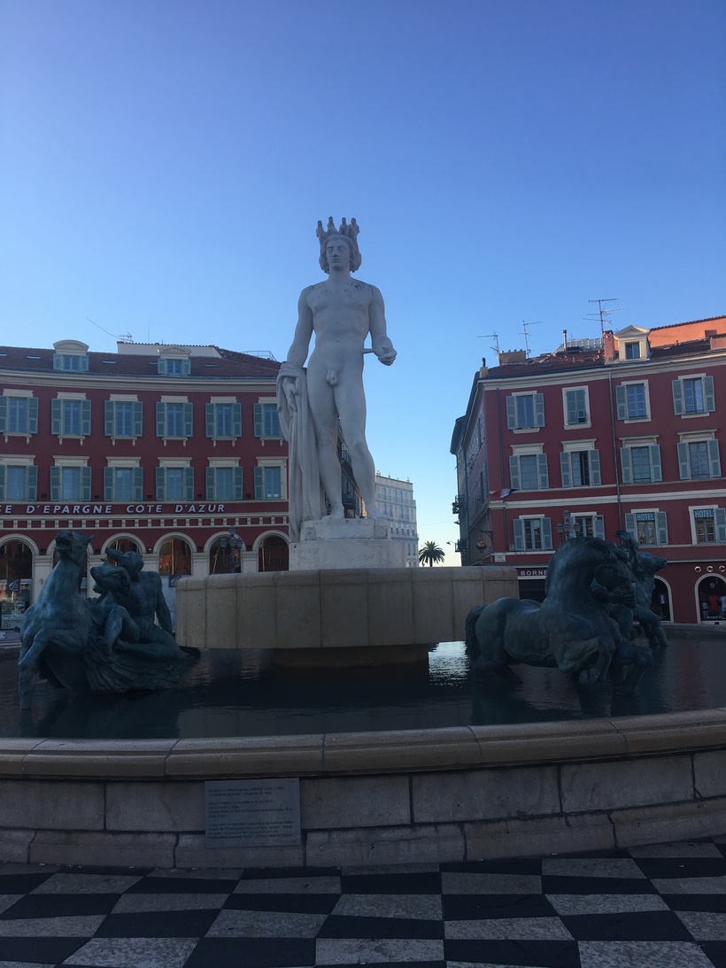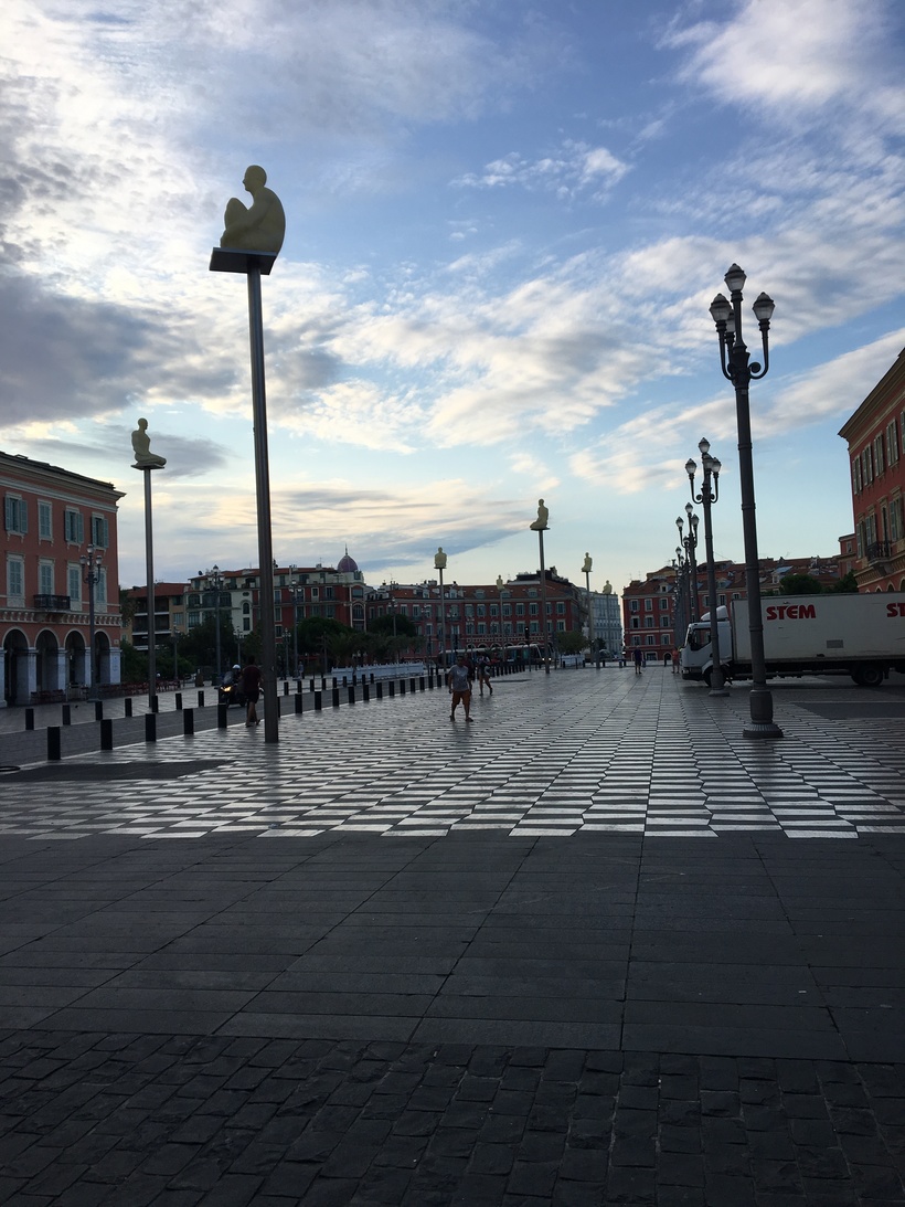 Но вечером здесь не пройти, гуляют все, кого нет на набережной. Уличные музыканты дают концерты. Белые статуи на шахматном поле, изюминка площади Массена, красиво подсвечены, вода в фонтане Нептупа золотится в лучах заката.
