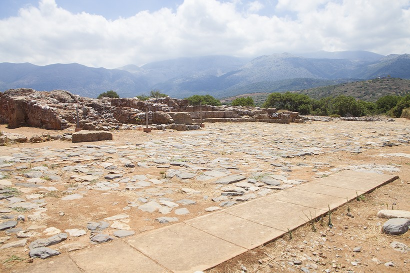 Итак, что мы имеем. Сворачиваем со старой дороги, ведущей от Херсониссоса к Малии, до собственно Малии не доезжая. Берег тут практически плоский, что для Крита удивительно – тут куда ни плюнь, то гора, то холмик, то скала торчит. Остатки дворца лежат на такой же плоской местности, однако встающие неподалеку горы в дымке делают пейзаж просто прекрасным.