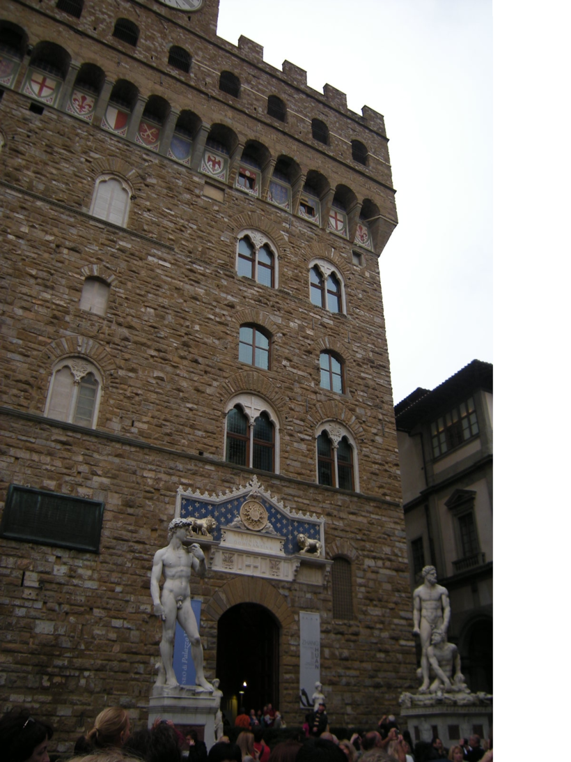 • Во главе площади стоит Палаццо Веккьо – крепость с высокой башней и зубчатым завершением. Очень красивое здание, строгое и сдержанное.