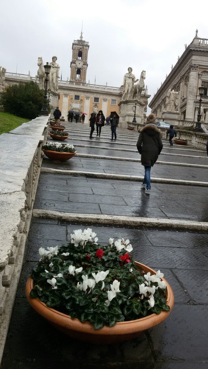 (Обратите внимание, как лестница украшена – у перил стоят плоские вазы с яркими цветами, которые радуют цветением даже в декабре (такова погода в Риме).