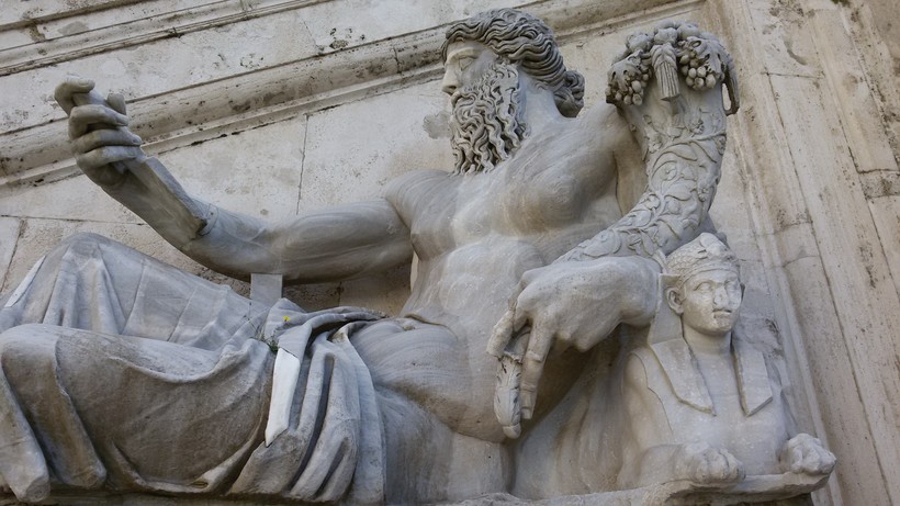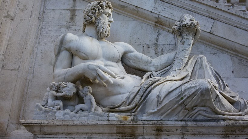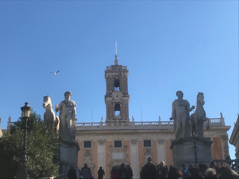 Площадь Капитолия – небольшая, находится между трех дворцов. Особенно красив центральный – Дворец сенаторов. Его украшают колокольня с часами, статуя богини Минервы, а также скульптуры-символы двух великих рек – Тибра и Нила. Люблю их рассматривать. Скульптуры такие величественные и выразительные; пострадали от времени, видны следы реставрации.