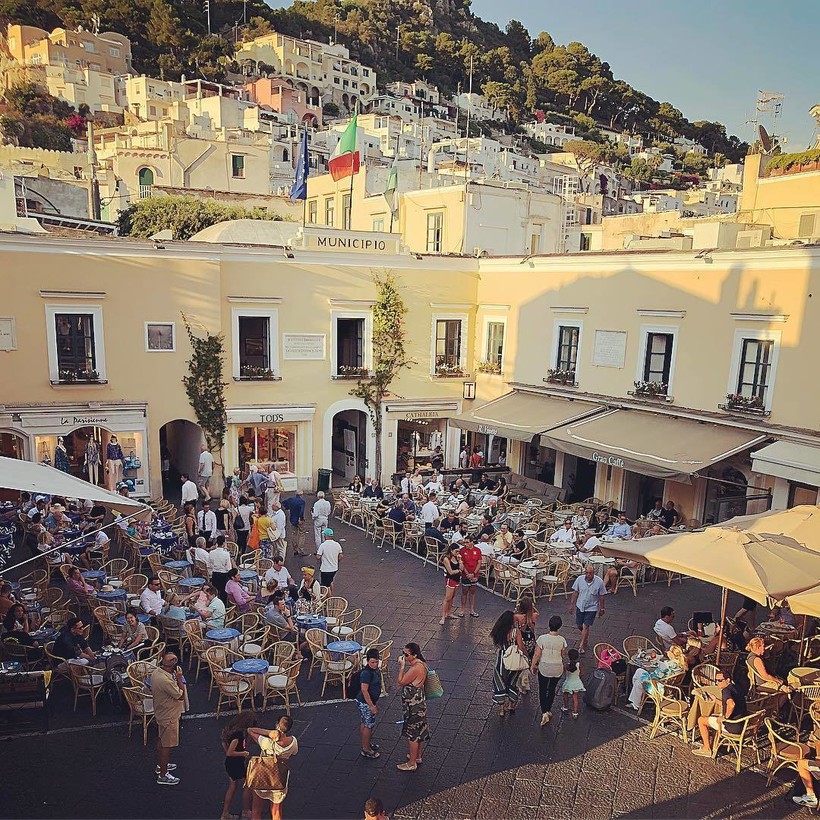 Здесь определенно есть что оценить. Площадь Умберто - эпицентр города. Являясь конечной точкой фуникулера, автобусов и такси, площадь вбирается в себя весь основной туристический поток. Заполненная столиками нескольких кафе и ресторанов, Пьяцца Умберто I буквально проживает жизнь прямо здесь. А так как здание муниципалитета как раз, что называется, стена к стене в этими кафе и ресторанами, то представьте, как тут поздравляют молодоженов. Я была свидетелем нескольких таких празднеств. Местные и туристы, гости и просто прохожие кричат и поздравляют пару. Они здесь же угощают всех шампанским, а иногда и сами рестораторы угощают. Идете вы так с чемоданом, а тут хоп и попали на свадьбу!