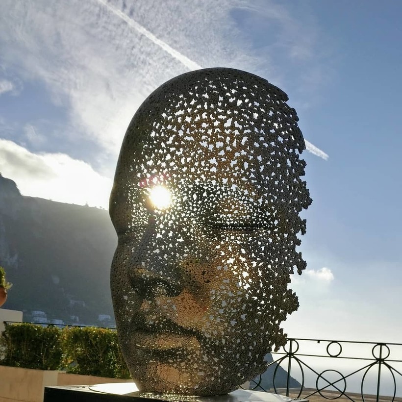 Площадь Умберто начинается от небольшой площадки, куда приезжают такси и автобусы - ага, они здесь запросто размещаются! Это также обзорная площадка, чтобы полюбоваться на Капри и на порт Марина Гранде. Здесь же вы можете увидеть весьма любопытную скульптуру - это маска, выполненная из небольших пластин, лишь в нескольких местах соединенных друг с другом. Складывается впечатление, что она стеклянная, через нее можно все увидеть.