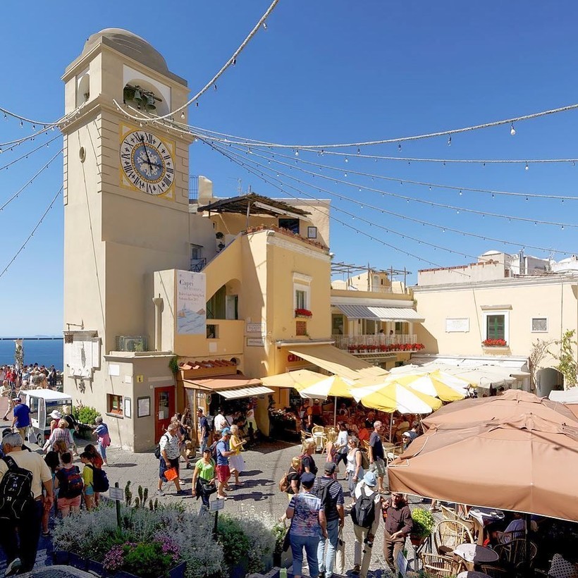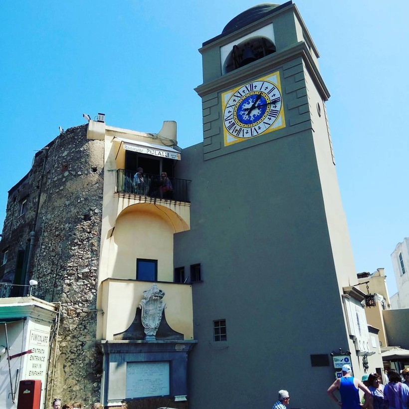 Особенность Капри еще и в том, что, за счет небольшой освоенной территории, где можно что-то строить и размещать, здесь в одном здании могут быть (смотрите на фото, как пример) и муниципалитет, и несколько ресторанов и кафе, и магазины, и даже жилые помещения. Ну а что, места мало, всем нужно разместиться! И здесь же городская башня с часами, чей колокол звучит, пожалуй, на весь остров.