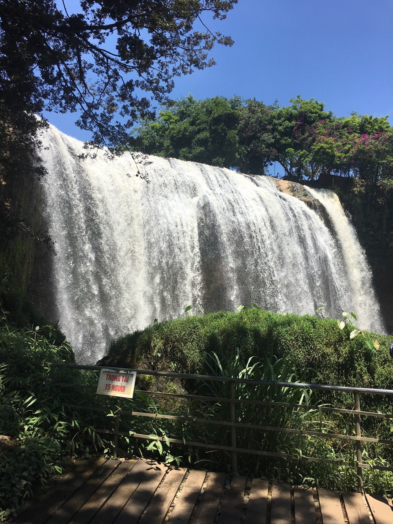 Вход к природной достопримечательности платный, с весьма символической ценой билета в 10 000 донгов (15-20 руб). Сначала мы оказались на обзорной площадке над водопадом, но оттуда зрелище не самое впечатляющее. Мы вышли на тропу и начали спуск по скользким камням к озеру, образованному мощными струями водопада.