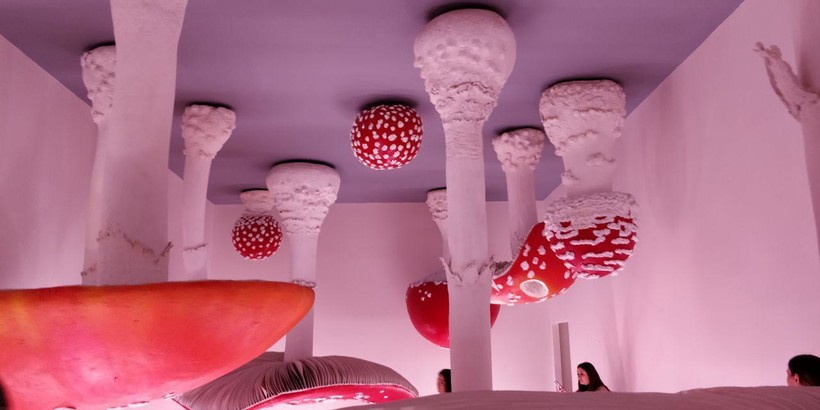 Пару этажей выше нужно проходить по полностью тёмному коридору, держась только за поручень. Ощущения нереальные. Из коридора выходишь в комнату с мухоморами, которые свисают с потолка. По коридору раза 3 прошёлся для полноты ощущений.