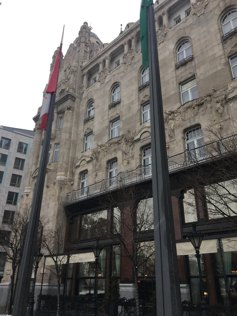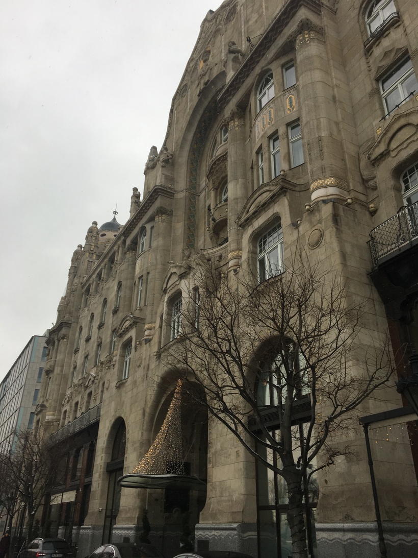 Так я открыла для себя дворец Грешем. Дворец Грешем - шикарное здание с великолепной архитектурой, стоящее прямо на берегу Дуная. Окна Дворца смотрят на Дунай и виды, безусловно, самые красивые в городе на холмы Буды и Королевский дворец на холме. К моему сожалению, дворец оказался не музеем, а отелем.