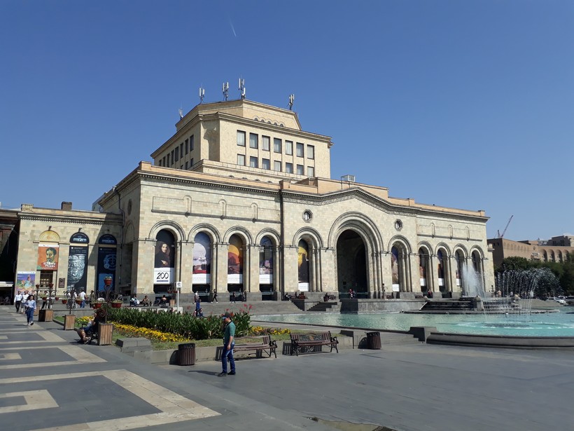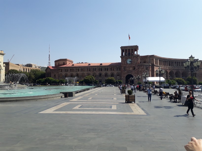 Это одна из самых оригинальных площадей, которые мне когда-либо встречались. Ее форма несколько необычна и состоит из двух геометрических элементов – трапеции в северной части и овала в южной. Площадь формируют пять зданий, выстроенных из розового туфа в стиле неоклассицизма. С севера ее ограничивает величественное здание национального музея Армении с рядом расположенными поющими фонтанами. Овал же образуют здание правительства с часами на торцевой стороне фасада и здание министерства, центральное здание почты Армении, и самый пафосный отель страны – Marriotti. А в центре овала, вокруг которого организована автомобильное круговое движение, вложена плиточная мозаика по задумке имитирующая национальный орнамент. Внешний облик площади сразу вызвал у меня ассоциацию с традиционными европейскими площадями с ратушами, о Ереване напоминали лишь едва уловимые национальные мотивы в декоративном оформлении зданий.
