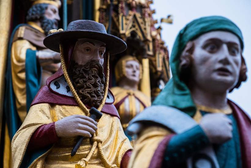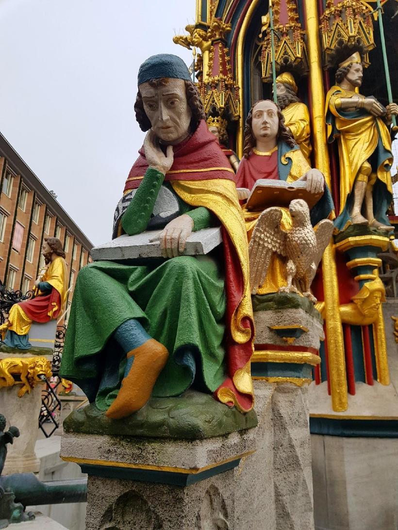 - Рассмотреть скульптуру, обойдя фонтан по кругу. До недавнего времени я и сама не подозревала, что Прекрасный фонтан украшают целых 40 скульптур. Если можно так выразиться, то здесь представлена полная картина мира Великой римской империи. Найдутся здесь и Философия с 7 свободными искусствами, и Моисей с пророками и, даже, 9 мужей славы, в числе которых есть Юлий Цезарь и Король Артур. Однажды и мне повезло улучить момент, когда туристы разбрелись по площади, а я смогла без суеты поразглядывать лица этих героев, что и вам советую.