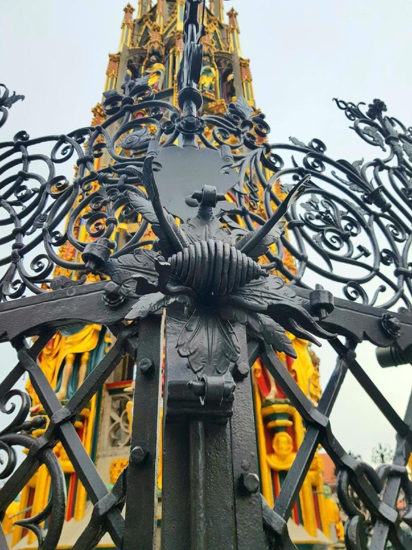- Покрутить кольца на счастье. На самом деле, в ограду фонтана вмонтировано несколько колечек, однако лишь два из них – латунное и железное – умеют вращаться. О том, какое из них на самом деле приносит удачу, ведутся споры не один век, но традиционно туристы крутят латунное, а сами нюрнбержцы – железное. По-моему, остаётся только проверка опытным путём – покрутить сразу оба.
