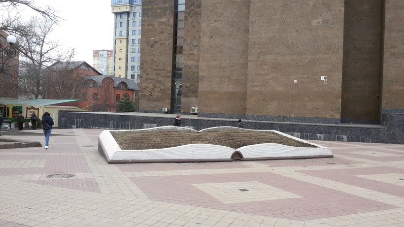Рядом с ним не так давно появилась огромная раскрытая книга со страницами из зеленой травы, возле нее летом любят фотографироваться: дети залезают на зеленые «страницы» и становятся иллюстрациями.