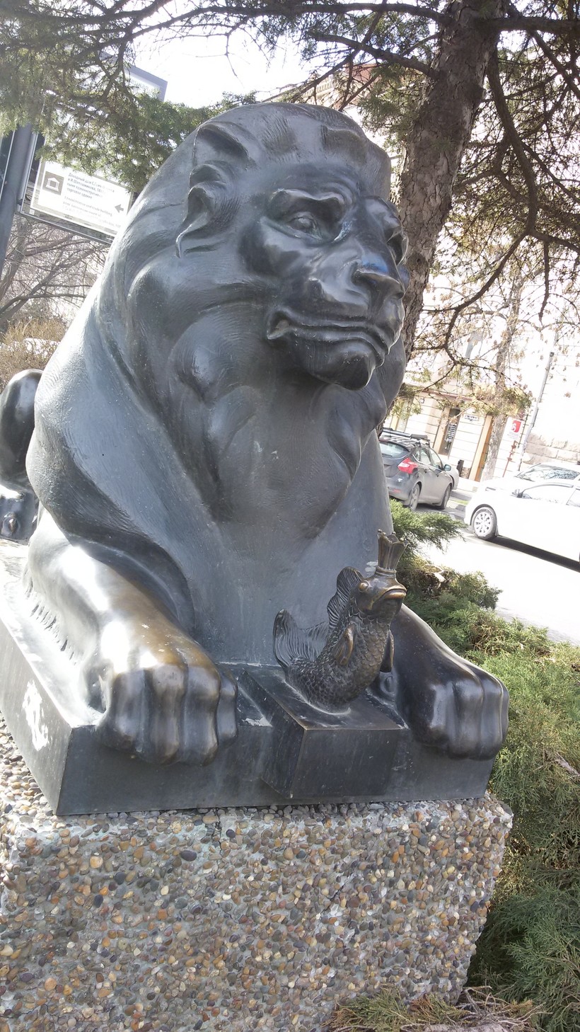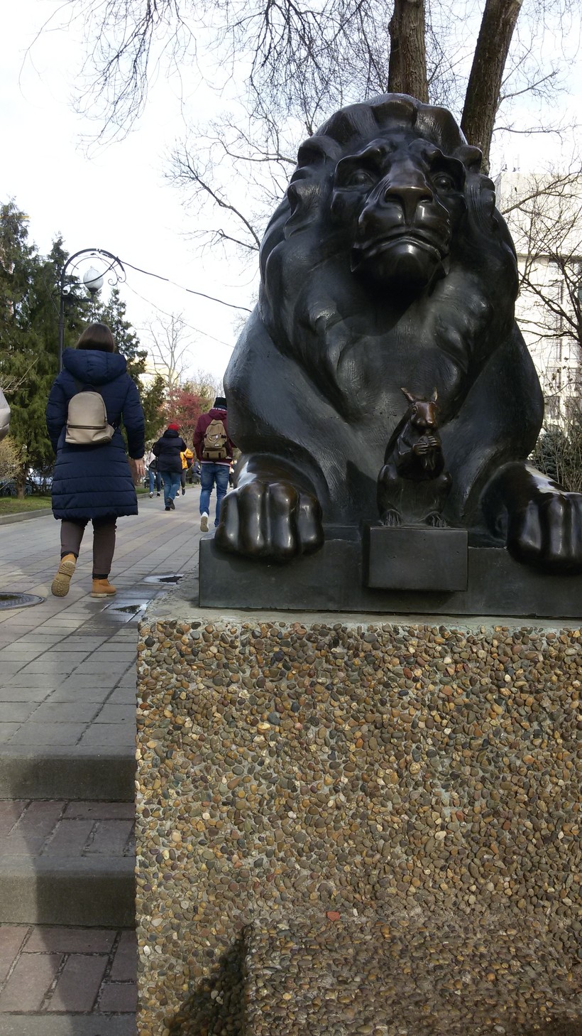 А еще скульптуры. Например, вот такие четыре симпатичных крупных льва, как будто охраняющие миниатюрных героев пушкинских сказок – Золотого петушка, царевну Лебедь, Золотую рыбку и Белку (которая, помните, «песенки поет, да орешки все грызет…»).
