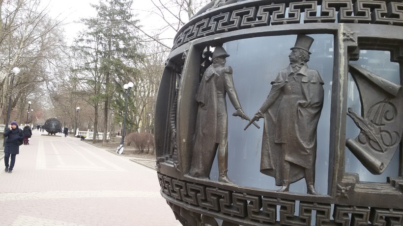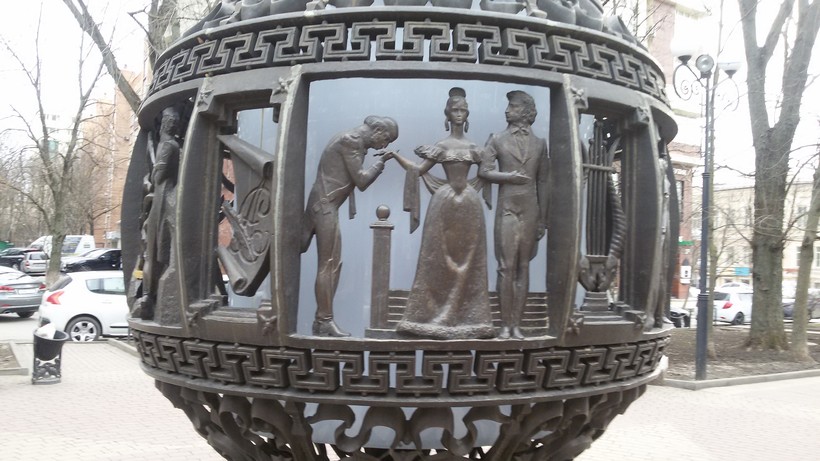 Но самые оригинальные скульптуры на улице Пушкинской – это два крупных шара. Один – с фрагментами из жизни Пушкина, другой – с сюжетами из «Евгения Онегина». Шары фотогеничные, на снимках интересно получаются.
