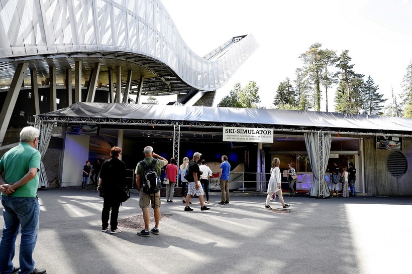 Я даже вообразить не могу, насколько страшно съехать с него на лыжах. Вернее, немножечко могу, потому что там же находится симулятор прыжков с трамплина - это такая капсула, туда засовывают решившихся на данный эксперимент туристов и симулируют спуск, как будто ты на лыжах на всех парах летишь с этой прекрасной горки. Стоит удовольствие недёшево, по-моему, что-то около 90 крон, это порядка 8-8,5 евро, и длится 10 минут, но эти 10 минут, пожалуй, того стоят, потому что, конечно, ощущения непередаваемые, а главное – совершенно безопасно, ты всё-таки сидишь в уютной капсуле, а не спускаешься на самом деле.