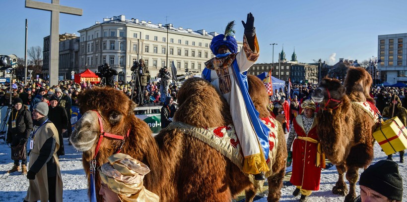 - Посмотреть праздничную процессию, приуроченную к Дню Трех Королей. Это католический праздник, который отмечается 6 января, а Три Короля — это Волхвы Каспар, Мельхиор и Бальтазар, согласно легенде, первыми пришедшие поклониться новорожденному Христу. Поляки — народ религиозный, и отмечают этот праздник с размахом. До этого я видел аналогичную процессию в Кракове, после — в Жешуве, но в Варшаве, как и положено столице, шествие было особенно красочным, на роль Бальтазара нашли настоящего негра, ехавшего на живом верблюде, а Каспара изображал азиат (есть мнение, что волхвы были представителями разных рас). В Варшаве главная процессия движется как раз по Краковскому предместью к сцене, где проходит главный концерт (который я решил не посещать). Кроме того, прямо напротив кафе, где я сидел, находилась небольшая сцена, на которой также шло костюмированное действо.