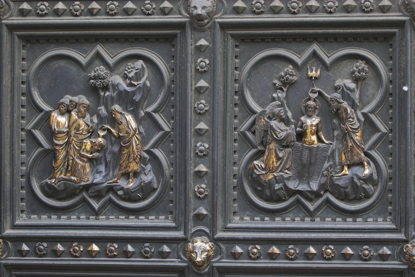Во-первых, меня очень впечатлили ворота баптистерия. Я, как большой любитель и ценитель, красивых и необычных дверей, не могла пройти мимо. Ворот в баптистерии три: южные, северные и восточные. Самые древние из них – южные ворота, украсил Андреа Пизано (тот самый, кто работал и над созданием колокольни Джотто). Его ворота – это 28 панелей с барельефами, 20 из которых изображают жизнь Иоанна Крестителя, а 8 – главные добродетели.