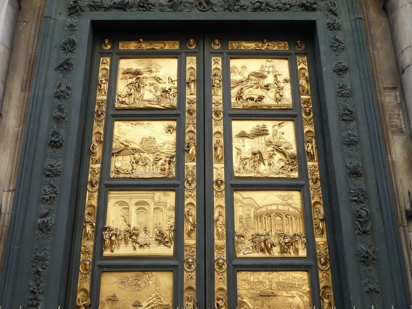 Северные и восточные ворота – плоды творения Лоренцо Гиберти, при этом восточные врата считаются самыми известными и уникальными. Их вес составляет около 400 килограммов, и они состоят из 10 золоченных панелей, каждая из которых иллюстрирует истории из Ветхего Завета. Восточные ворота баптистерии были названы Porta del Paradiso - Врата рая. По популярной здесь легенде, это название дал им сам Микеланджело.