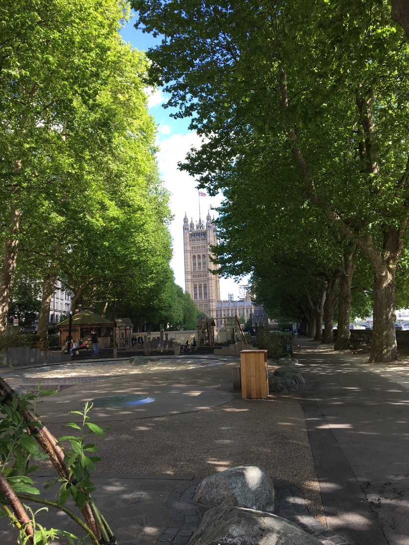 В последний мой приезд, я жила в Лондоне всего несколько дней, основная часть отпуска была мною проведена в других городах Великобритании. Обычно я бронирую отель около Гайд-парка, но в этот раз я забронировала отель недалёко от вокзала Виктории, чтобы было удобнее добраться до аэропорта Гатвик, откуда был мой рейс в Москву. Поэтому в этот раз, мои утренние прогулки, начинались не от Гайд-Парка, а по району Вестминстер. Так утром я решила прогуляться к Темзе, посмотреть на реку и по набережной выйти в центр. Выйдя к реке, я увидела очень красивый небольшой сквер, вдоль набережной и пошла по нему.