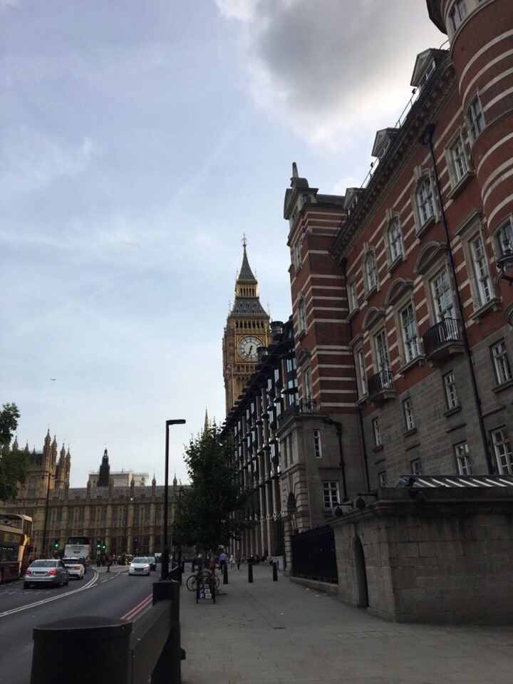 Здесь совсем не было туристов, он был достаточно узкий, стояли параллельно набережной жилые дома, видно с очень дорогими квартирами. В сквере гуляли родители с детьми, пожилые люди с собаками. Обстановка позволяла почувствовать себя местным жителем. В сквере стояли лавочки прямо у реки, были небольшие скульптурные композиции и детские площадки. Понемногу сквер расширился и я увидела интересное здание. И только подойдя совсем близко, я поняла, что это Вестминстерский дворец с торцевой стороны. Отсюда он казался, совсем другим, непривычным, не знакомым по парадным картинкам, башню Биг-Бен, отсюда видно не было. Зато прекрасно было видно другую башню -Викторию, которая на самом деле выше часовой башни, но не так известна. Обойдя здание парламента, я вышла на привычную парадную сторону. Все таки это очень красивое здание.