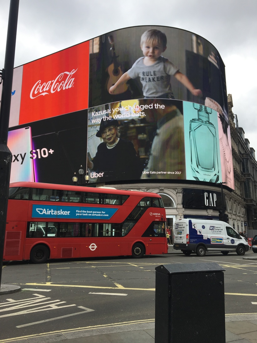 Огромная неоновая реклама, занимает все здание выходящее на площадь, картинки настолько яркие, что просто не вероятно как они не отвлекают внимание водителей. Движение транспорта тут невероятно интенсивное, правда количество пешеходов здесь в разы больше. Через площадь Пиккадилли проходят основные маршруты автобусов, которые стоят на светофорах несколько минут. Именно это позволило мне рассмотреть площадь достаточно хорошо и немного с высоты.