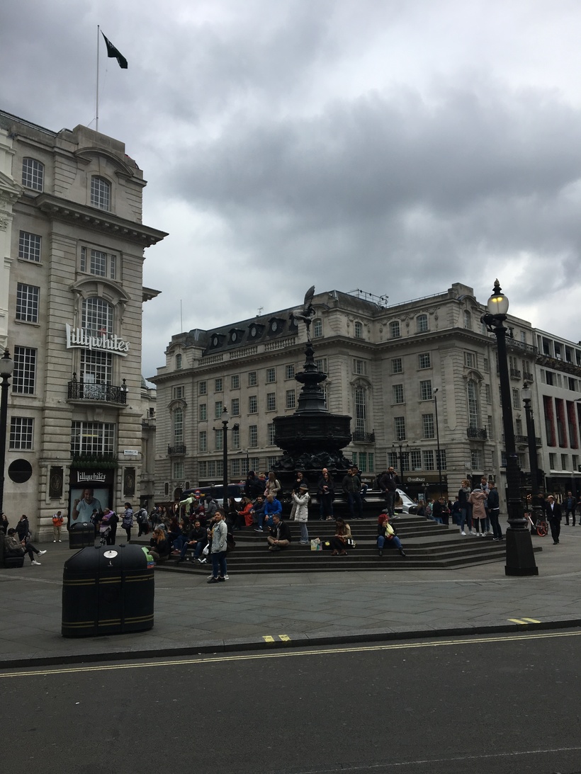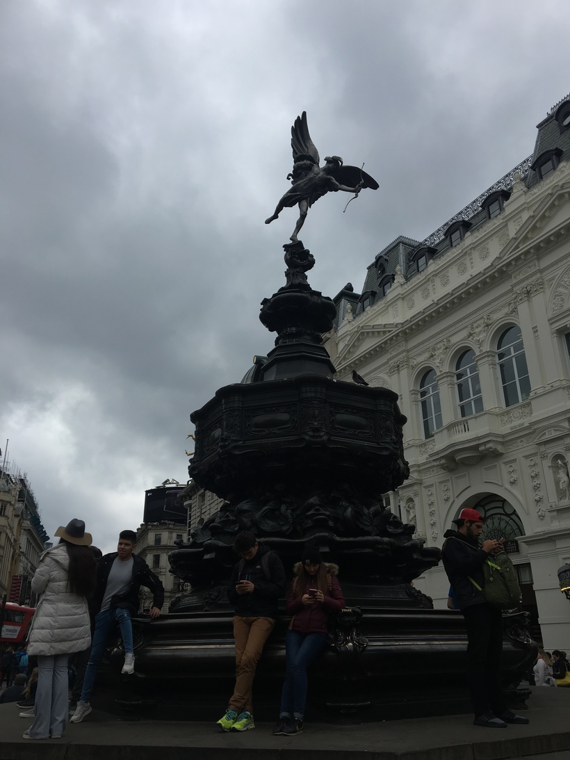 Приехав в город в мае, я уже знала всю его центральную часть. Поэтому могла хорошо ориентироваться и большая толпа, была мне уже знакома и привычна. Я доехала до площади Пиккадилли на автобусе, идти пешком от отеля мне было довольно далеко. А вот от площади я уже гуляла по городу пешком. Статуя Эроса открылась мне на этот раз с другой стороны.