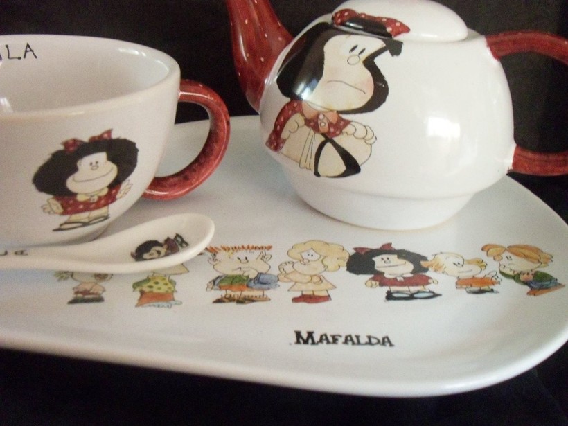 Мафальда, это вымышленный персонаж девочки 5-6 лет, которая никогда не росла. Героиня одноименного комикса задается весьма не детскими вопросами и по-взрослому рассуждает - о политике, экономике и социальной жизни и положении в стране. Она любит Битлз и терпеть не может мамин суп, а еще когда ее спрашивают кого из родителей она больше любит.