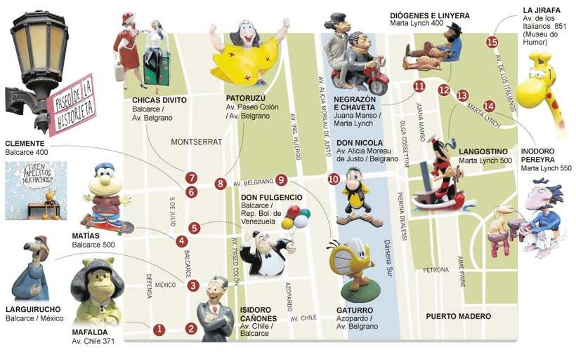 Но, гуляя, по воскресной ярмарке, прохожие часто спрашивают "А как найти Мафальду?". В воскресенье к скамейке с этой крохой всегда будет очередь, от желающих с ней сфотографироваться нет отбоя. Место для Мафальды выбрали не случайно, она сидит на скамейке рядом с домом в котором жил ее создатель Кино. Она не одинока, рядом есть фигурки ее друзей, а по всему Сан Тельмо разбросаны памятники героев других аргентинских мультфильмов и комиксов. Все вместе это называют Paseo de la Historieta.
