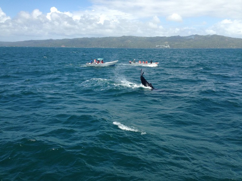 Потом нас повезли смотреть горбатых китов. Наличие китов народу особо не обещают, то есть, ты выплыл, кит не приплыл, ну какие претензии к киту? Однако нам повезло, именно в январе горбатые киты приплывают к этим берегам, чтобы размножаться, и киты - они очень любопытные, поэтому несколько из них подплыло довольно близко, побило хвостами по воде и выпустило пар. Мы очень порадовались такому везению. Хотя лодочка, на которой мы отправились к китам, была ещё более ненадежная, чем первая.