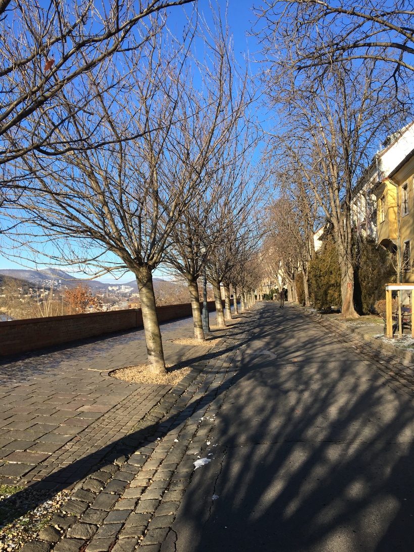 Вроде бы все знакомое, а свернёшь чуть в другую сторону и вот находишь что то новое и интересное. Так я поднявшись на фуникулёре на замковый холм к королевскому дворцу, пошла прямо к римским раскопкам. Идя вдоль них по старому городу я решила пойти по прекрасной пустынной аллее вдоль холма. Здесь виды открывались не на Дунай, где основные красоты и много туристов, а на противоположную часть города. Оказывается я здесь раньше не была, а место потрясающее. С одной стороны захватывающий вид на холмистую часть города, с другой маленькие домики старого города.