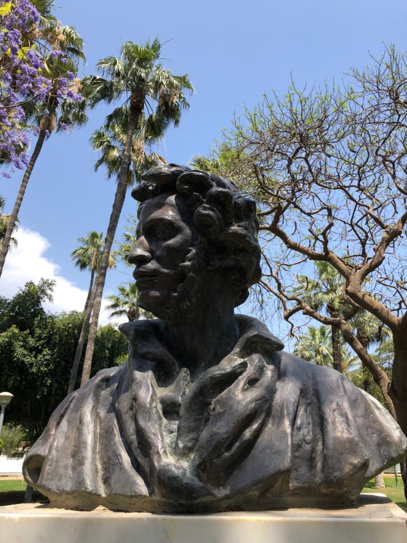 Но самая неожиданная встреча была с русским поэтом. Бюст Пушкина А.С. внезапно встретился нам на пути. С чего вдруг? Зачем? Как он тут оказался! Мы ничего не поняли. Стоит и стоит! А вокруг красивые деревья с фиолетовыми лепестками. До сих пор не знаю названия, но эти деревья прекрасны. А эти лепесточки вечно опадают.