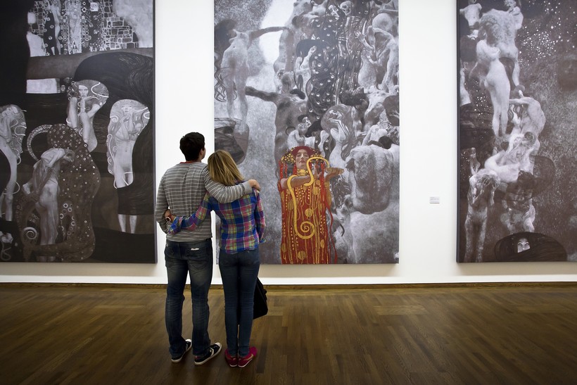 Первый пункт - это Густав Климт. От Климта в Вене никуда не деться, как от Моцарта и императрицы Элизабет. Это известно всем, кто хоть раз был в столице Австрии. Здесь, в музее, можно посмотреть на картины Клинта. И, вы знаете, они хорошо смотрятся на открытках, на сувенирах и... они прекрасно смотрятся вживую! Кто бы сомневался, конечно...