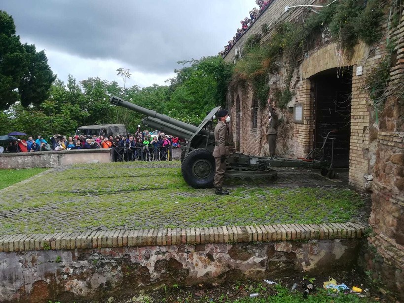 Это событие собирает массу зрителей. Народ устраивается где придется, стараясь оказаться поближе к пушке, чтобы не только всё лучше увидеть и услышать, но и сделать хорошие фото и видео. На этой фотографии можно увидеть, сколько собралось зрителей вверху, на смотровой площадке.