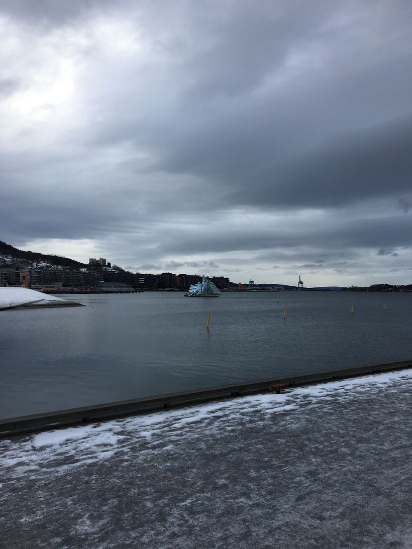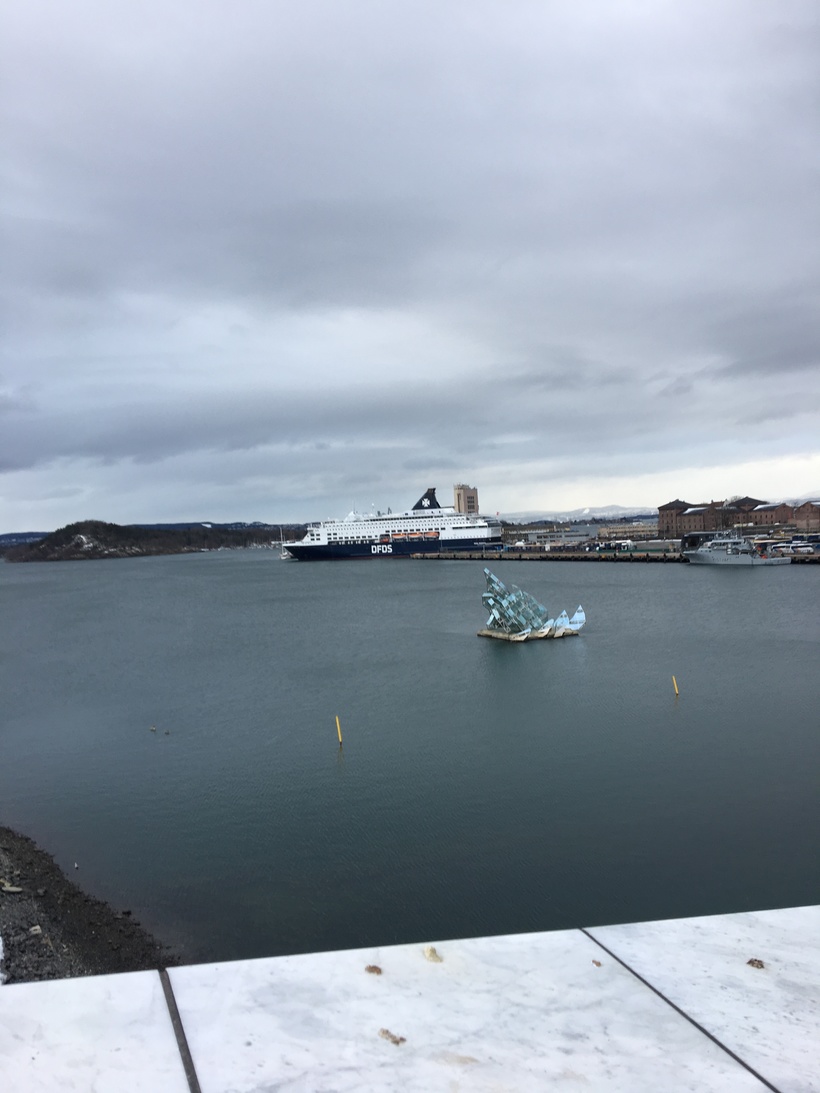 Сначала я увидела часть фьорда с крыши Оперного театра Осло. По берегу стояли здания, на воде виднелись кораблики. Один странный кораблик стоял прямо посреди залива, какой то он был непонятный. Только потом я прочитала что это водная скульптура. Правда здорово. Я думаю это единственная такая в мире. Главная, что она не неподвижная, при ветре паруса шевелятся и кажется, что она плывет.