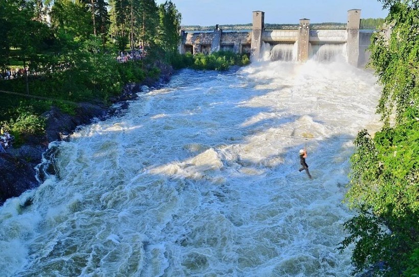 Не скажу, чтобы прямо очень сильно была под впечатлением. Но люди вокруг были в восторге. Все снимали, фотографировались,кто-то бежал по берегу в направлении движения течения. Смельчаки проносились на тарзанке через бурлящий поток. Такое чувство, что жизнь закипела. Просто до этого прогуливаясь по тихим улочкам Иматры, удалось впасть в такое беспечное неторопливое состояние. А тут все вдруг все зашевелилось. Мы тоже немного ускорились тем же маршрутом- вдоль течения по дорожке, пошли смотреть, куда же понесся этот поток воды. Природа, правда, очень красивая. С одной стороны зеленые ели, деревья, шикарный дурманящий воздух, с другой- обрыв. Похоже на Карелию. Вдоль русла предусмотрены перила, поэтому безопасно, даже если вы с детьми.