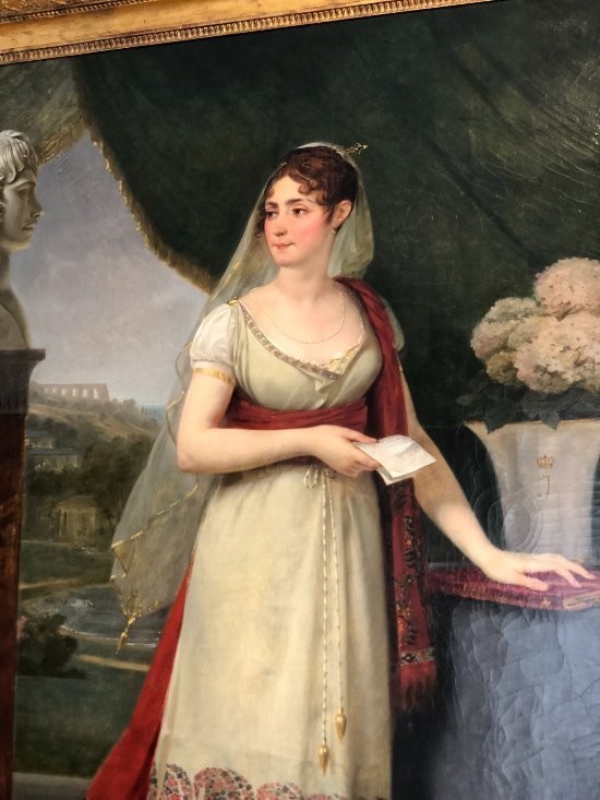 Я какое-то время сидела на одном из пуфиков напротив портрета Жозефины, фотографию я приложила выше. Портреты того времени всегда наполнены бесчисленным количеством тайных знаков, посланий и символов. Цвета использованные художником, вид из окна, предметы находящиеся с ней в комнате и даже то, что она держит письмо - все было тщательно продумано, и носит свой особый смысл.