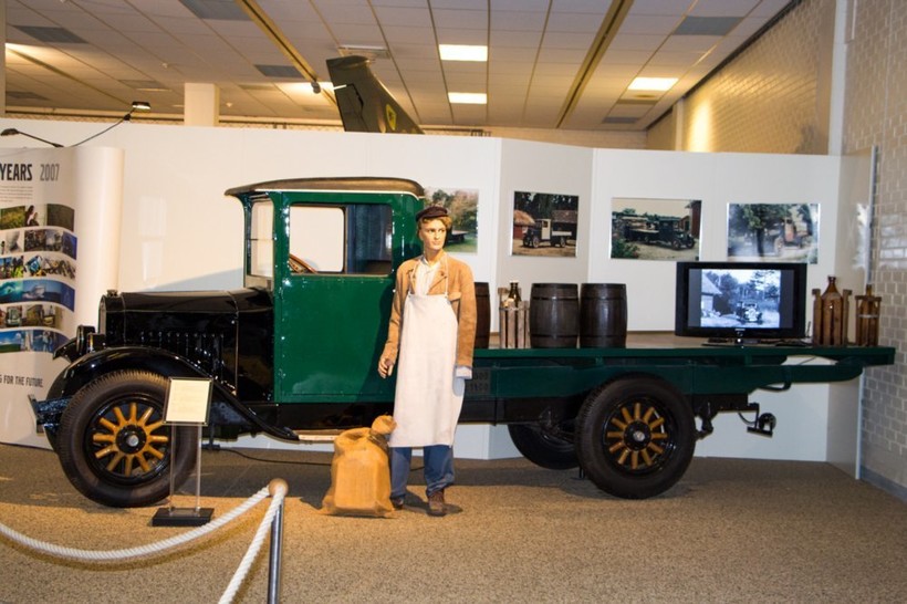 С легковыми автомобилями стоят и автобусы, и грузовые, пожарные. Интересными показались с открытыми кузовами – как же товар не скатывался на дорогу, там же не было даже стенок?! И всё подобрано к модели – фон, восковая фигура, одетая в костюм тех лет.