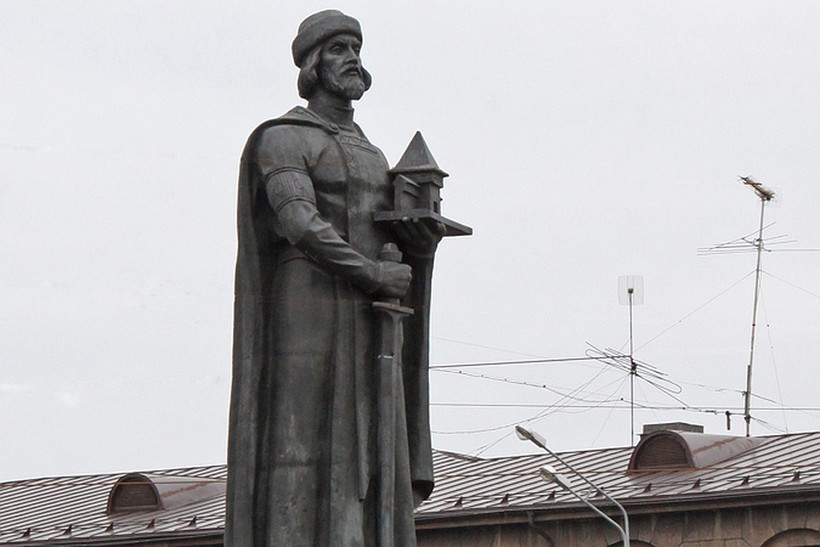 Левой рукой он держит макет Кремля. Могу ошибаться, но это говорит о том, что Ярослав изначально был созидателем, а не разрушителем.