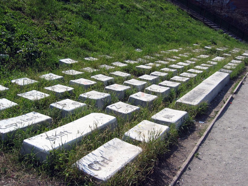 Ну что ж, друзья мои, могу я сказать. Если бы я ехала сюда намеренно, то увиденное, скорее всего. меня бы разочаровало. Но так как я наткнулась на клаву совершенно случайно, она вполне произвела на меня впечатление. Единственное, я не сразу поняла, что это клавиатура. поначалу я заметила бетонные пенечки, с определенной закономерностью торчащие из земли. При этом они еще достаточно знатно заросли травой, поэтому догадаться сходу, что это клавиши клавиатуры не представлялось возможным. И лишь при более детальном рассмотрении и прочтении надписей на клавишах, я поняла, что лицезрею один из современных арт-объектов, которые украсили старинный Екатеринбург совсем недавно. Но, кстати, официально достопримечательностью города клавиатуру власти пока так и не признали.