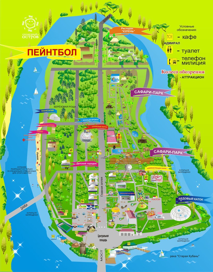 Солнечный остров довольно большой парк по меркам Краснодара, считается одним из лучших мест для семейного времяпровождения, предлагает множество видов развлечений: ролики и велосипеды, спортивные площадки для активного отдыха, катание на локах, рыбалку, кафешки, аттракционы, сафари-парк и дале крытый каток.