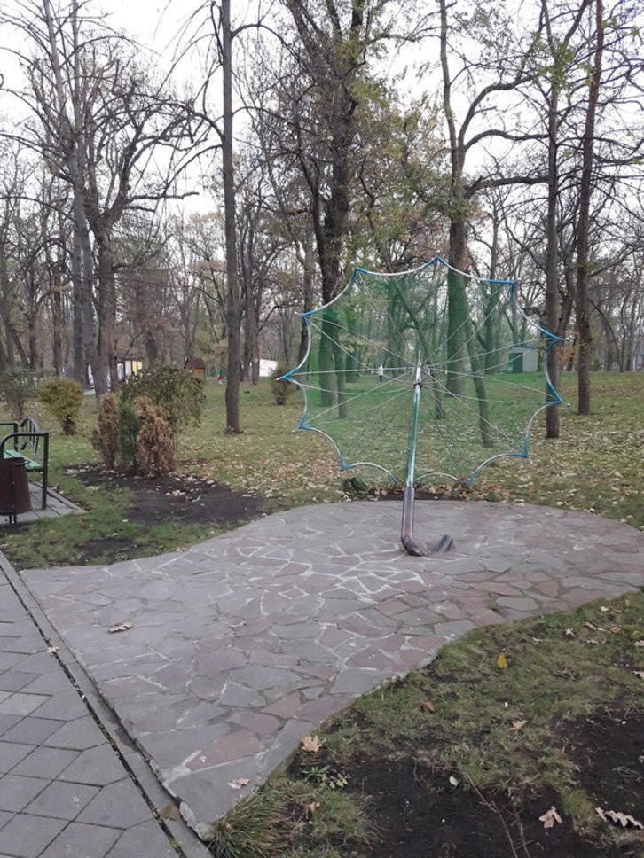 На входе мне попался на глаза такой вот зонтик. Летом по нему заползает вьюн и получается очень красивая клумба.