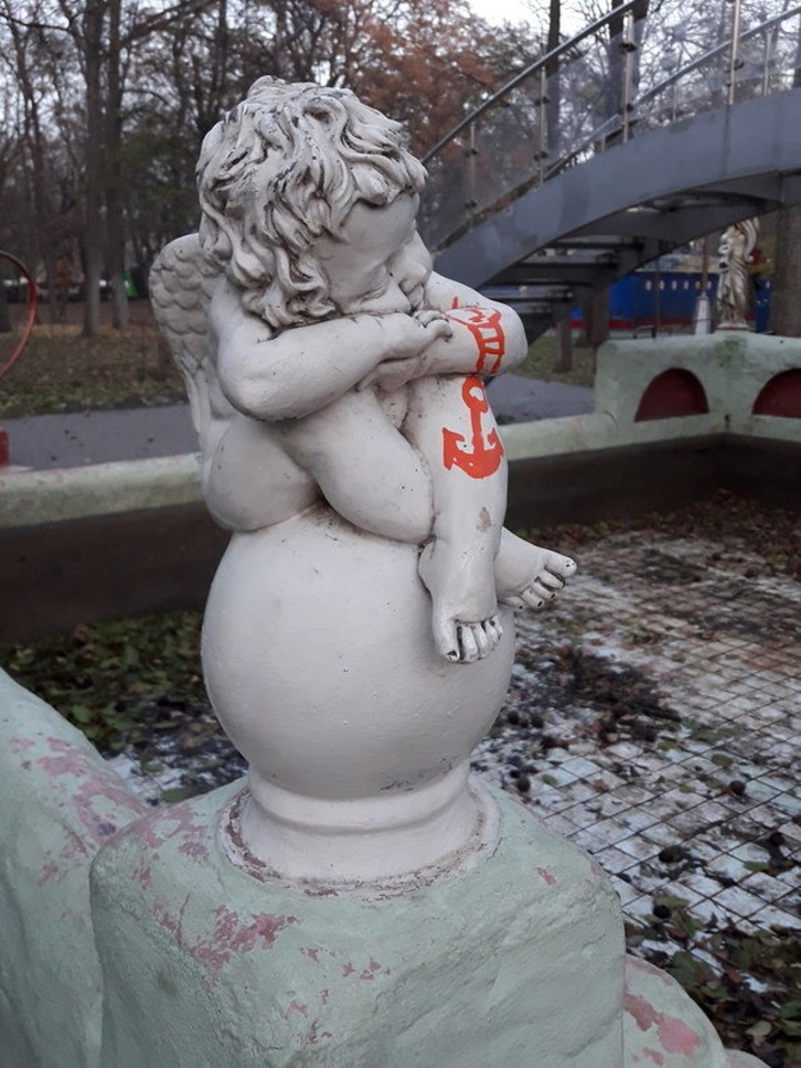 Я сразу представила, как там красиво летом, когда под ним в маленьком бессейне вода. Вход на него охраняют миленькие ангелочки, одного чьи-то не очень умелые руки постарались разукрасить.