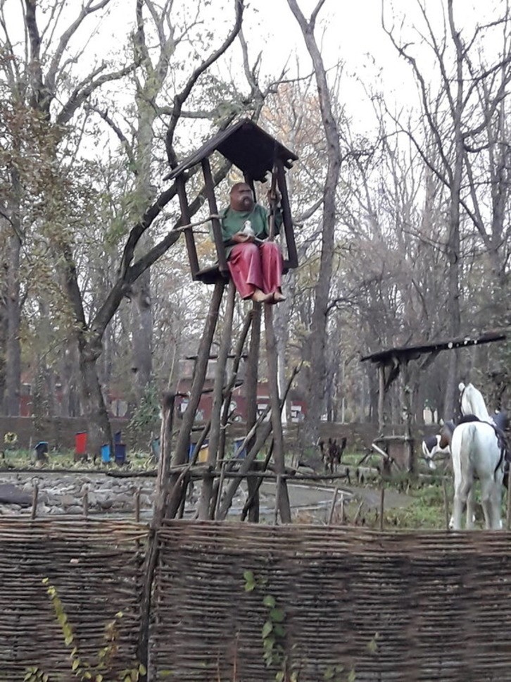 Между дубами, тополями и ясенями я заметила белую лошадь, пасущуюся на лужайке. Как оказалось, это была декорация к аттракциону. "Хуторок" – туда так ии хочется попасть внутрь. Можно прокатиться вдоль имитации казачьей деревни, мимо коня и ослика. Чудесно воссозданы декорации дома и дозорной вышки. Конь мне издалека показался очень похожим на живого. Замечтельная идея, сочетание совренности и истории в этом парке.
