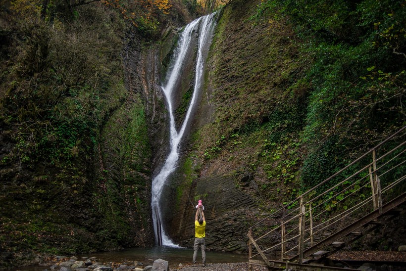 Стоимость такси — 450 рублей. Отправление от самого центра Сочи. Советую надеть удобную обувь, которая будет обладать нескользкой подошвой. Лестница, ведущая к водопаду очень шаткая и мокрая. Будьте предельно осторожны.
