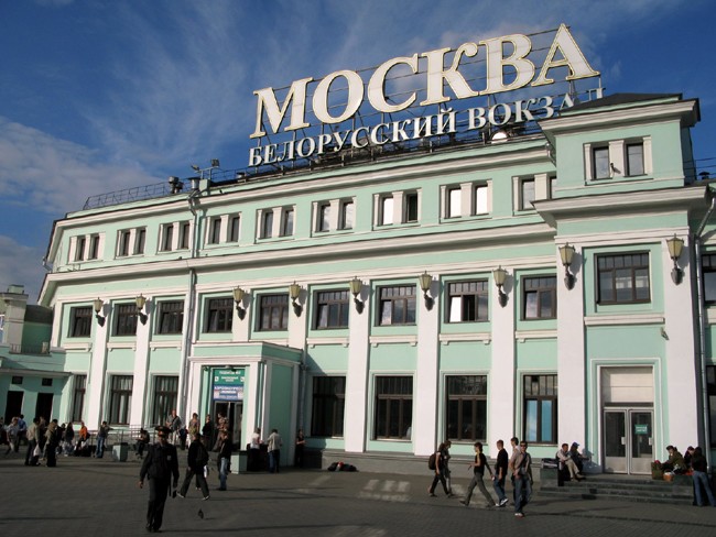 Белорусский вокзал находится по адресу пл. Тверской заставы, д. 7. (учитывая размеры Москвы – самый центр города). До него можно без труда добраться на метро или такси. Здесь есть туалеты, кафе, wi-fi, в общем все необходимое. Выглядит он так: