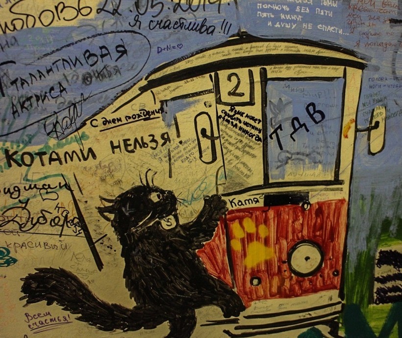 Подъезд весьма причудливо расписан,здесь есть и восторженные отзывы посетителей музея и поклонников творчества, и сюжетные картинки по мотивам произведений писателя.