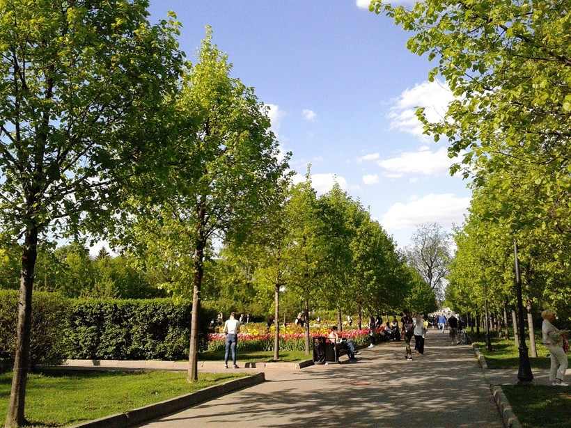 Зашли мы в огромные кованные с позолоченными узорами ворота и увидели несколько аллей с множеством лавок, везде деревья, кустарники, цветы. Чем дальше идешь вглубь парка – тем чище становится воздух, забывается, что ты в Москве.