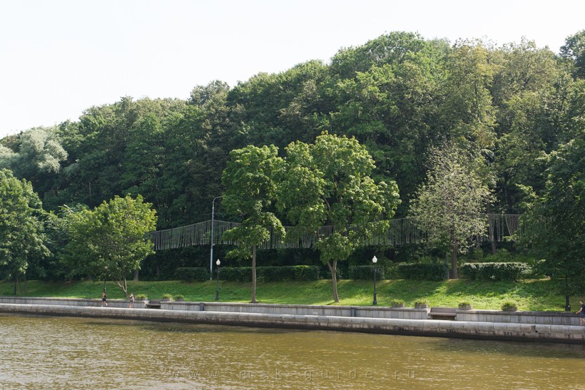 Кроме бегающих людей я здесь ничего примечательного не увидела, даже уток не нашлось, даже сама вода грязноватая. Поэтому мы спустились на берег реки Москвы, мимо проходят теплоходы, которым можно помахать рукой. Слева можно увидеть Воробьёвы горы, справа – парк им. Горького.