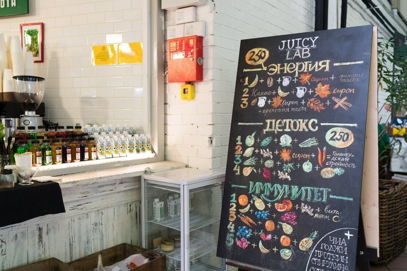Для всех почитателей правильного питания и соковых диет на Даниловском рынке работает бар со свежевыжатыми соками JuicyLab. По словам создательницы, Екатерины Родионовой, в основе ее заведения смеси соков, которые по своим сочетаниям оказывают полезное влияние на иммунитет, или способствуют очищению организма от шлаков. В меню можно выбрать из пяти разных соков для детокса или из трех для иммунитета. Кроме того, мы можете попросить добавить в ваш сок что-то из списка, например, суженый манго или ягоды годжи.