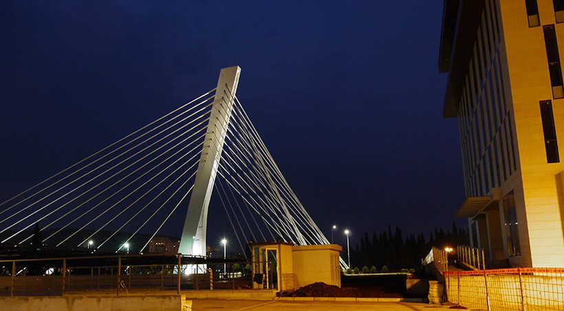 Конструкция Моста смотрится очень изящно. От внешних столбов отходят тонкие нити. Чем-то Мост напомнил мне паутинку. С некоторых ракурсов он смотрится, будто его просто сюда поставили, не согласовывая проект с окружающей обстановкой. Но это даже в чем-то плюс - придает определенный шарм городу.